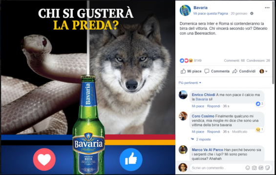 E proprio al calcio è dedicato il post che ha avuto una maggiore quantità di engagement, in cui vengono sfruttate le reaction (Beereaction, in questo caso) per ottenere un coinvolgimento maggiore da parte dei fan, chiedendo un pronostico sull’esito di Inter-Roma.