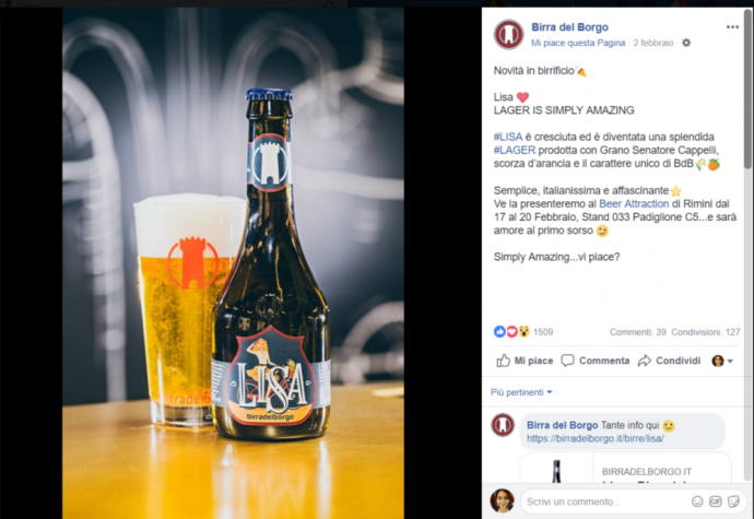 Il post di Birra del Borgo che nel trimestre analizzato ha raccolto maggiori consensi è quello dedicato al lancio della una nuova birra lager Lisa.