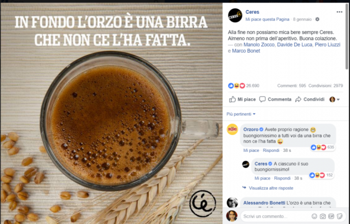 Ed ecco il post della Ceres che ha ottenuto maggiore successo (oltre 30mila interazioni), da segnalare anche l’intervento tra i commenti di un altro brand, azione sempre più comune.