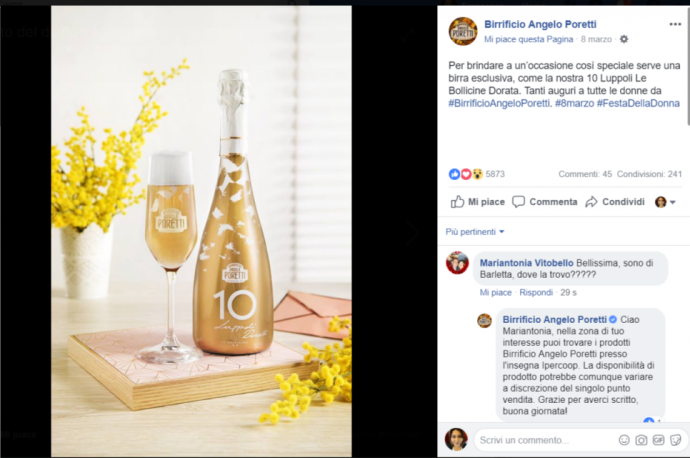 A conferma di questo vediamo come il post che ha avuto maggior successo sulla pagina sia quello dedicato alla festa della donna, con un’immagine molto soft e elegante che abbina un mazzo di mimose a una bottiglia della Poretti 10 Luppoli Le Bollicine Dorata.
