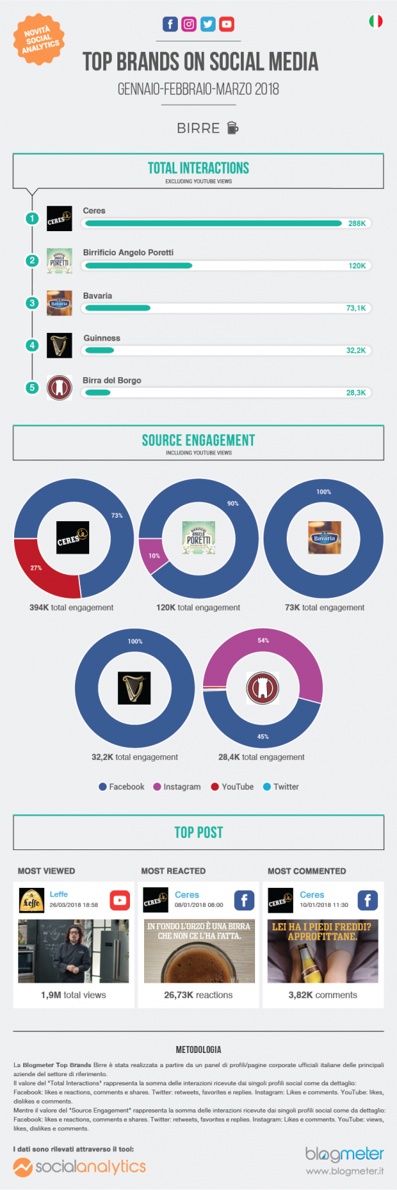 Al secondo posto di questa classifica troviamo il birrificio lombardo Angelo Poretti, che pur potendo contare solo su 100mila fan e follower, contro gli oltre 700mila della Ceres,ottiene un total engagement di 120K, contando su un ampio distacco rispetto agli altri brand del settore.