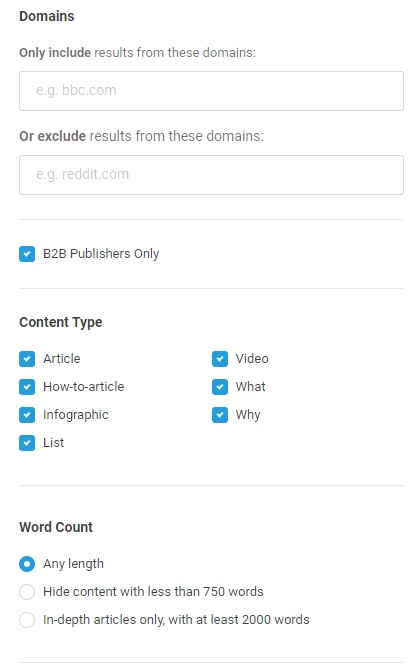 Per chi lavora nel settore B2B, molti risultati proposti da BuzzSumo possono sembrare…inutili. Per fortuna questo strumento ha aggiunto un filtro che ti consente di mostrare solo contenuti scritti da fonti che si occupano di B2B.