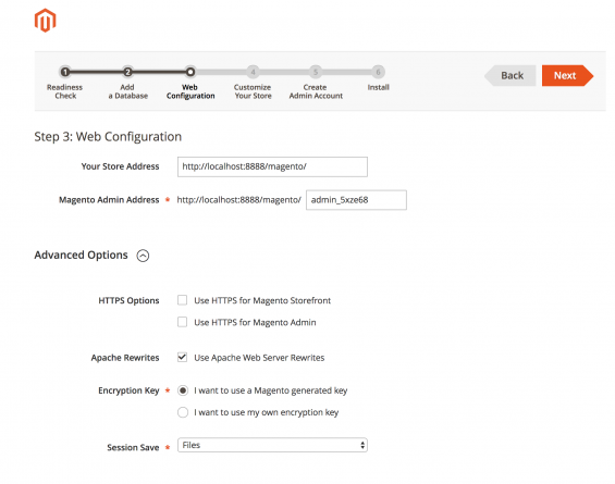 Dopo aver inserito il database, il wizard vi chiederà di definire la configurazione web del vostro e-commerce, quindi le URL del sito, dell’amministrazione, e altri dettagli (per esempio l’utilizzo del protocollo https).