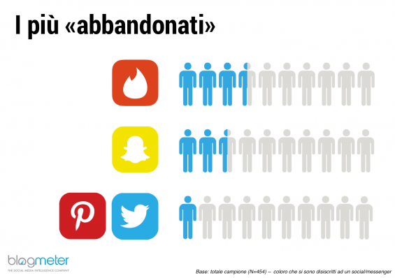 Chissà se anche i social network soffrono di sindrome da abbandono. Se è così dobbiamo preoccuparci per Tinder, che risulta quello da cui più utenti si sono cancellati, ben 3,5 italiani su 10 hanno deciso di eliminare il proprio account. Seguono Snapchat, con il 25% e Pinterest e Twitter, con il 10%.