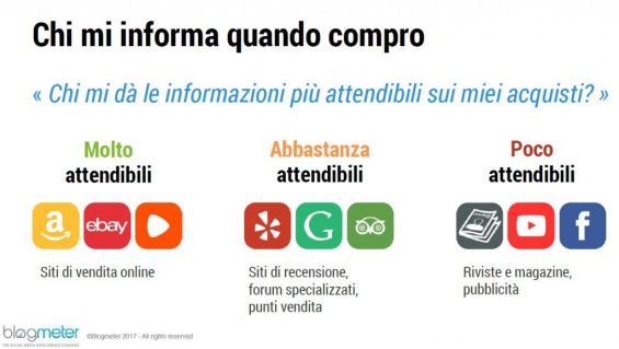 Però se si deve acquistare qualcosa la percezione cambia: i più attendibili sono i siti di acquisti online (Amazon e Ebay) e siti di recensione (TripAdvisor), e non più tv e stampa.