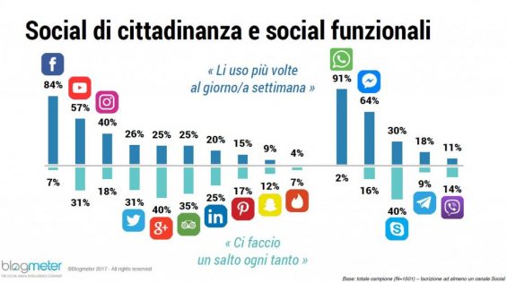 Quando stabiliamo la strategia per la nostra presenza online dovremo, secondo la ricerca, tener conto di come gli utenti percepiscono i social. Esistono, infatti, dei “social di cittadinanza”, quelli che costruiscono la nostra personalità all’interno del “mondo digitale”. Qui il re è Facebook – l’84% degli intervistati ha dichiarato di utilizzarlo più volte al giorno – seguito da YouTube, Instagram e Whatsapp.
