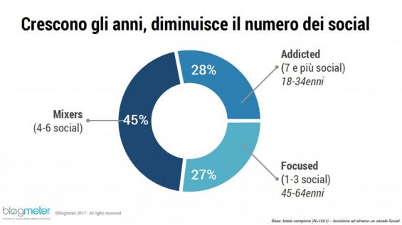 Se tra i 18 e i 35 anni gli intervistati dichiarano di essere iscritti a più di 7 social network (e app di messaggistica), sopra ai 45 si fa più selezione e si mantengono, al massimo, 3 canali.