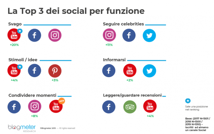 Secondo il report, presentato a inizio giugno, Facebook è ancora il social network più usato dagli italiani, seguito da YouTube e Instagram. Queste tre piattaforme fanno parte di quelli che vengono detti “social network di cittadinanza”, che servono a costruire e affermare la nostra personalità all’interno del “mondo digitale”. Mentre i social a cui ci rivolgiamo in maniera più sporadica, quando abbiamo bisogno di risposte a delle necessità specifiche, denominati social funzionali, sono Trip Advisor e Skype.