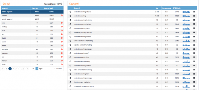 Come potete notare, l’immenso database di SeoZoom ritrova 4895 keyword correlate a content marketing, e per ciascuna fornisce i volumi di ricerca, un coefficiente di concorrenza e il CPC medio.